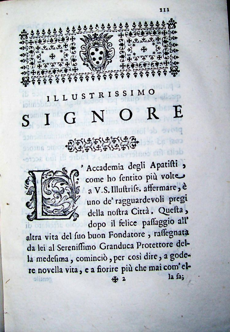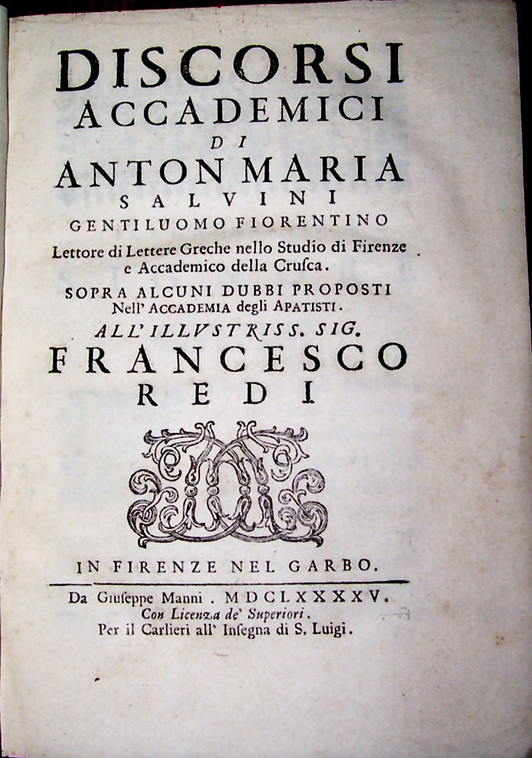 Published in 1695 by Giuseppe Manni, in Firenze nel Garbo.Seller notes: pp XIV - 442 (2). Bound in C18 full leather with five raised bands and gilt lettered label. CONDITION: corners bumped, light scuffing, front cover hinges cracked at top and bottom (but holding firm and tight). Very clean and attractive copy.