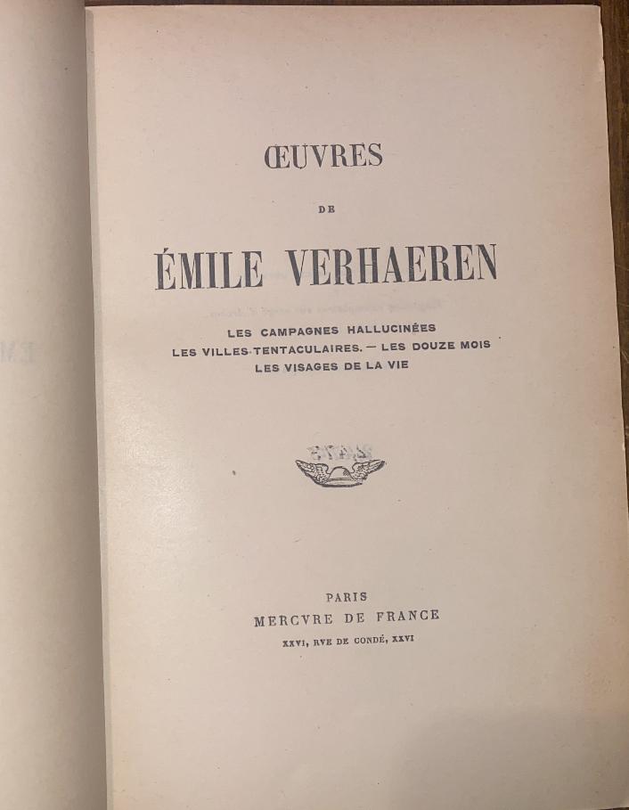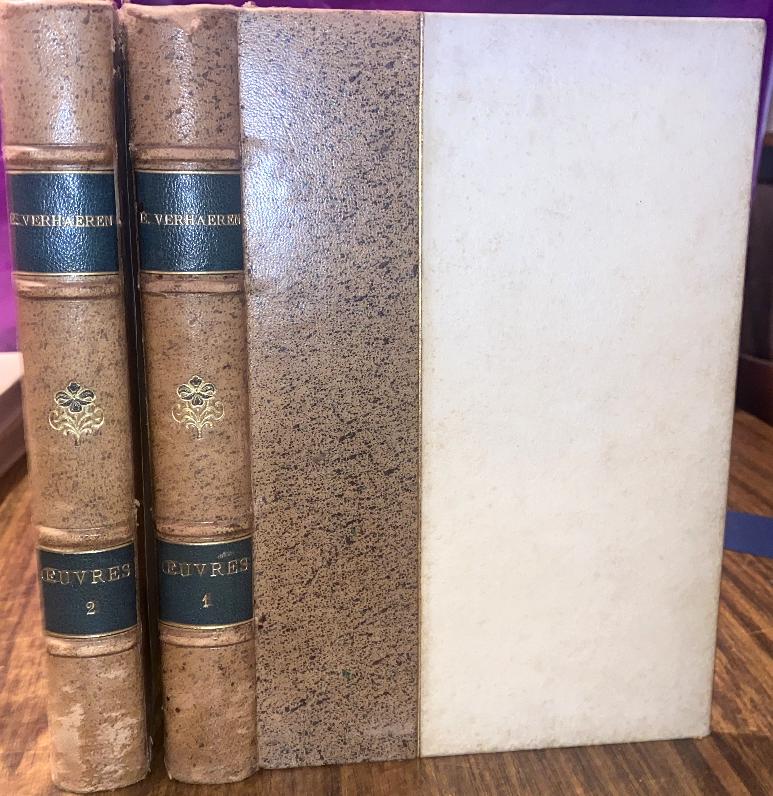 Seller notes: PP: 358 + 350. Vol.1- Les Campagnes Hallucinées - Les Villes tentaculaires - Les douze Mois - Les Visages de la Vie. Numbered Edition: #2474; Vol.2- Les Soirs - Les Débacles - Les Flambeaux noirs - Les Apparus dans mes Chemins - Les Villages illusoires - Les Vignes de ma Muraille. Numbered Edition: #1375; Leather backed boards, top edges gilt and original wrappers bound-in at the rear. Little rubbed, attractive set.